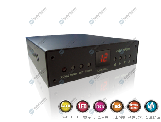 DM-100H 為工業級的輸位頻道接收器,工業級專用模組,採用標準機櫃式安裝設計,高穩定DVB-T數位電視接收,共同天線的最佳選擇,一勞永逸,擴充簡便,免費電視的標準配備。